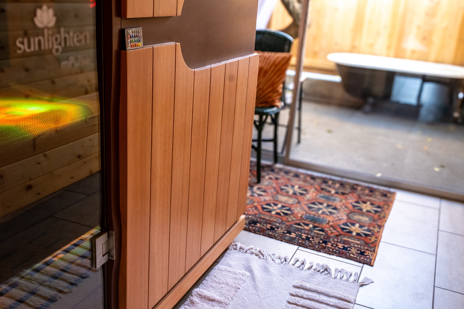 Each suite is equipped with 100% cotton Turkish towels, a bottle of spring water with electrolytes, and a gorgeous eucalyptus Sunlighten mPulse smart sauna.